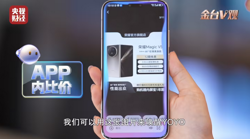 在节目中,央视财经的主持人表示,面对双 11 复杂规则,消费者往往会通过对比多个平台寻找最佳价格和优惠。而借助搭载 YOYO 智能体的荣耀 Magic8,AI 技术可帮助大家快速筛选商品,提供性价比分析,简化购物决策,实现从哪个平台下单最划算的智能建议。