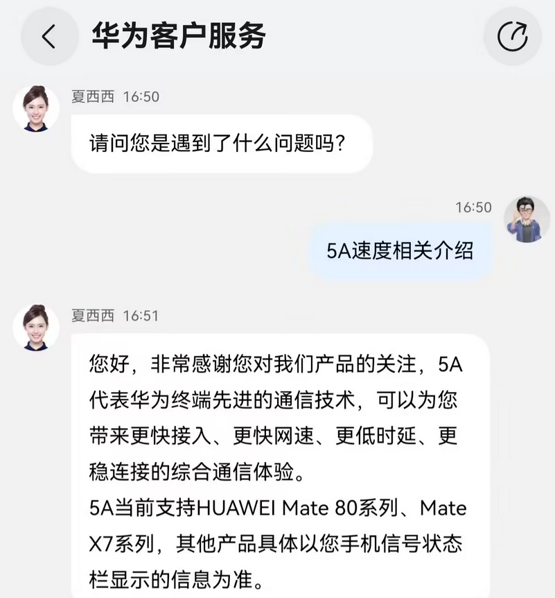 5A 当前支持 HUAWEI Mate 80 系列手机、HUAWEI Mate X7 系列折叠屏手机,其他产品具体以手机信号状态栏显示的信息为准。