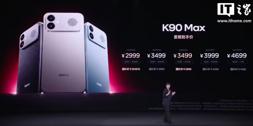 阿财网 4 月 21 日消息,小米 REDMI K90 Max 手机今晚正式发布,售价 3499 元起,首销期全版本补贴 300 元,首销价 2999 元起,国补价 2549.15 元起。