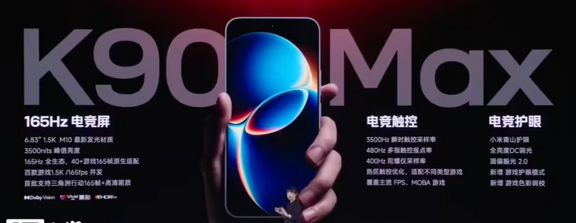 REDMI K90 Max 可选“太空银”“暗影黑”“天际蓝”配色,采用铝合金中框、极窄边设计、极简格栅开孔。REDMI K90 Max 是小米首款内置风扇散热手机,搭载独立密闭风道、全金属轴承结构,支持 IP66/IP68/IP69 整机防尘防水,通过 5 万小时老化测试。同时,这款手机还带有仿真涡流风道,减少路径弯折带来的乱流,风量利用率可达 78.6%,号称“散热效率疾速拉满”。根据小米官方晒出的测试数据,REDMI K90 Max 支持 100 秒降温 10 ℃,降温速度相比友商的两款机型更快;游戏测试也能够稳帧更持久。此外,REDMI K90 Max 可调 3 种风扇模式,最强档的噪音也只有 32dB。REDMI K90 Max 搭载联发科天玑 9500 处理器,还有 AI 独显芯片 D2、LPDDR5X Ultra 内存、UFS 4.1 闪存,支持百款游戏的 1.5K + 165Hz 并发。