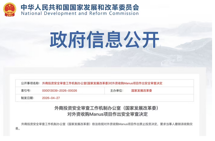 阿财网 4 月 28 日消息,备受各方关注的 Manus 并购案于 4 月 27 日靴子落地,中国外商投资安全审查工作机制办公室(国家发展改革委)依法依规对外资收购 Manus 项目作出禁止投资决定,要求当事人撤销该收购交易。